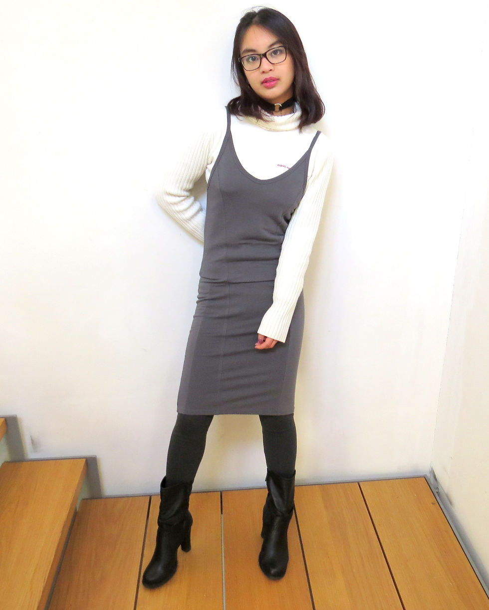We love to wear summer type clothes in winter. Mae shows how we can layer a dress for cold weather. Wearing a jumper under a dress is such a trend we mostly have seen in asian street style. It gives a cute look while still being confortable and warm. As for Jenn, a winter look can not be a warm outfit without some faux fur. This coat is quite a statement, so she wanted to stay simple for her outfit by paring black skinnies with a regular sweater.